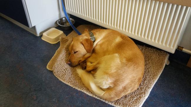Renates Hund hat sein eigenes Plätzchen im Büro.