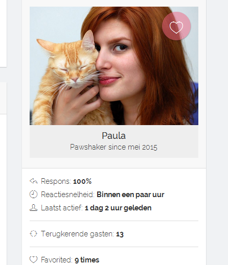Natürlich verdienen Deine eigenen Haustiere einen Ehrenplatz auf Deinem Profil. Auch ein Haustierprofil kann jederzeit angepasst werden. Du kannst Fotos hochladen und Informationen über Rasse, Geschlecht und Verträglichkeit mit anderen Haustieren eingeben. Das ist für Tierbesitzer, die Deine Dienste in Anspruch nehmen möchten, nämlich ein wichtiger Faktor! Du kannst auch eine nette Beschreibung hinzufügen und etwas mehr über Deinen Schatz erzählen. Alle Tiere findest Du auf unserer Wall of Paws.